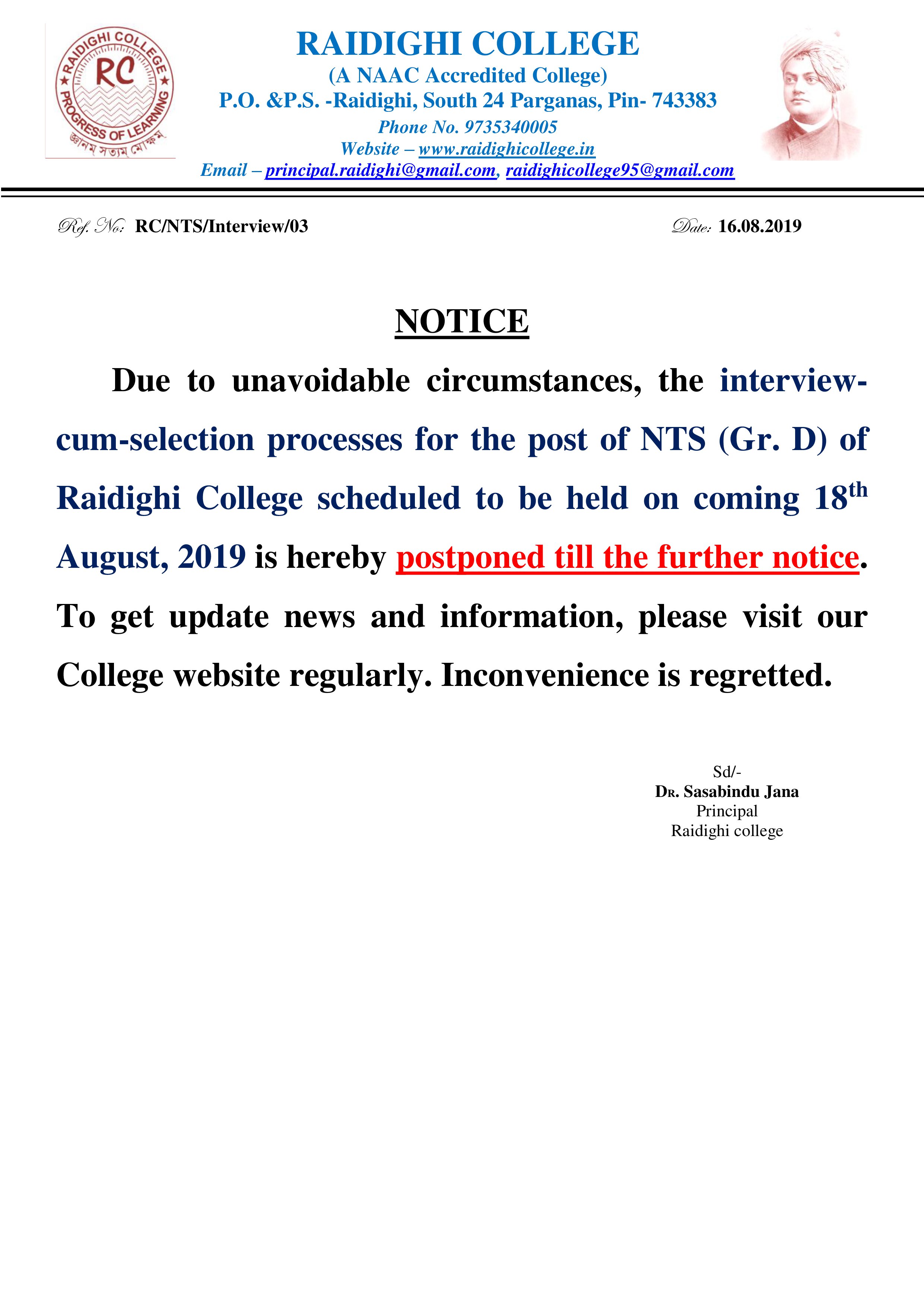 Cancellation Notice of the Interview for the post of NTS (Gr. D) scheduled to be held on 18.08.2019 |